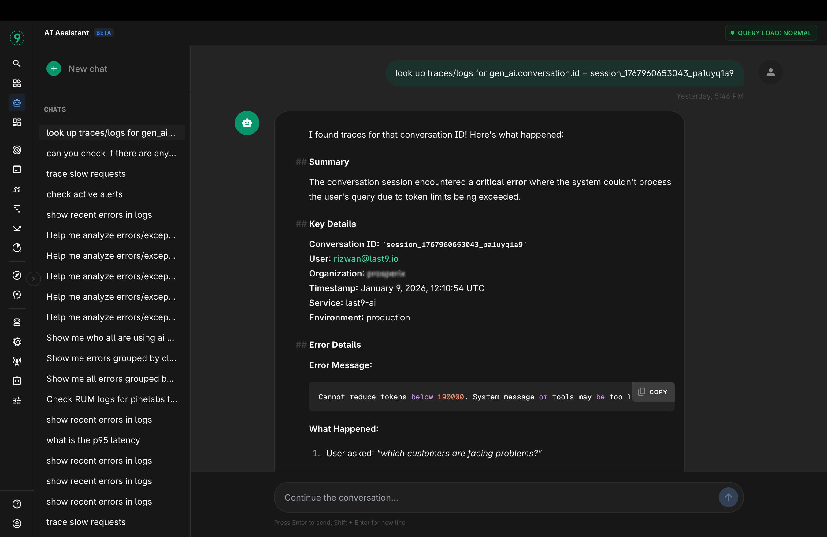 Coming to agentic debugging, I really have stopped doing queries on dashboard and started using our MCP / Ai assistant we have to help me get some insights. For example when debugging errors for one of our customers instead of looking up traces I just asked the assistant on my secondary monitoring while runnning deployments on the other after a while I glanced to the left and realised what exact issue they ran into