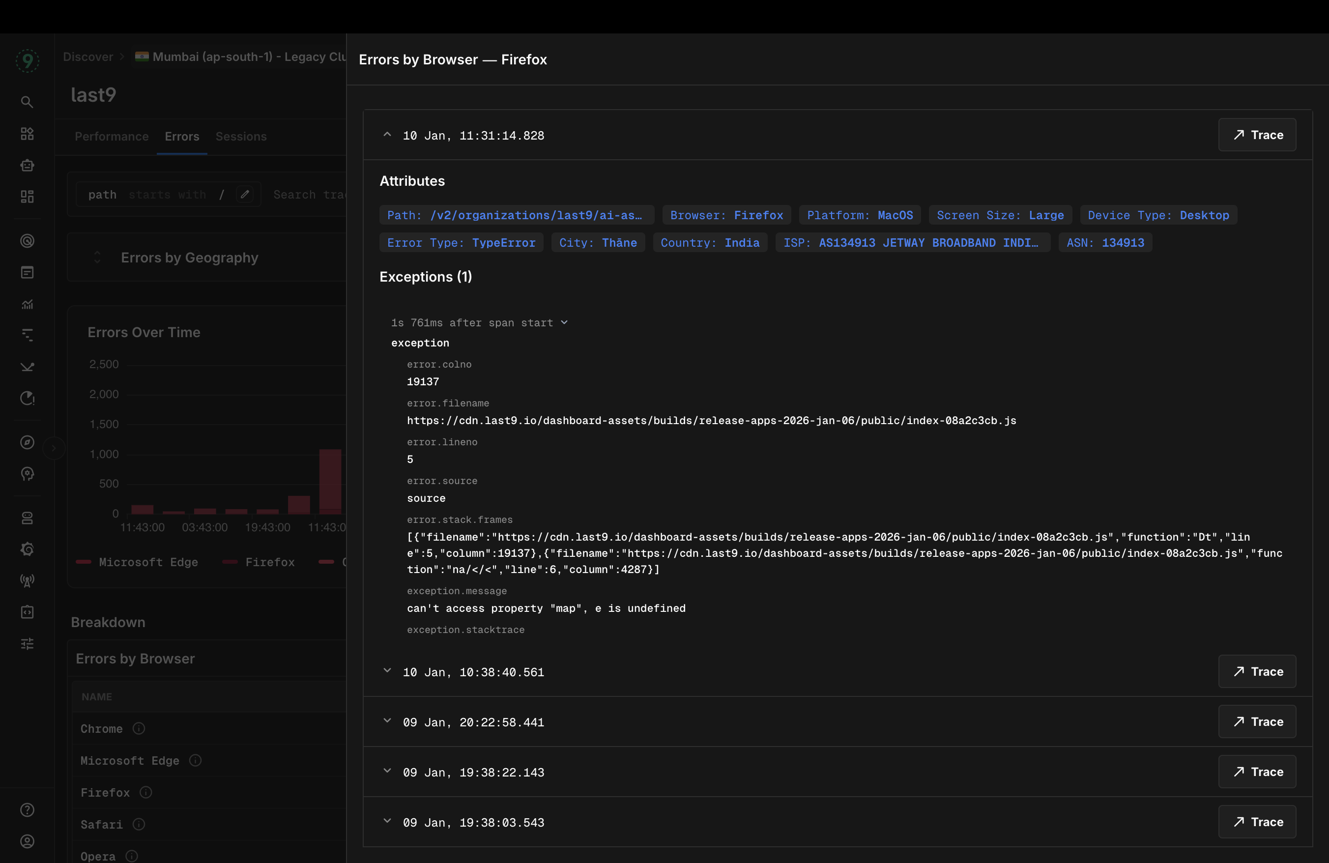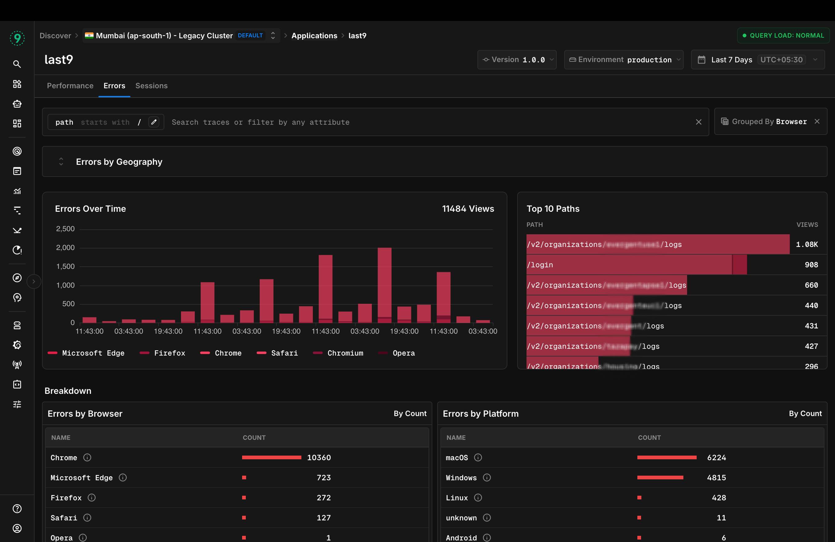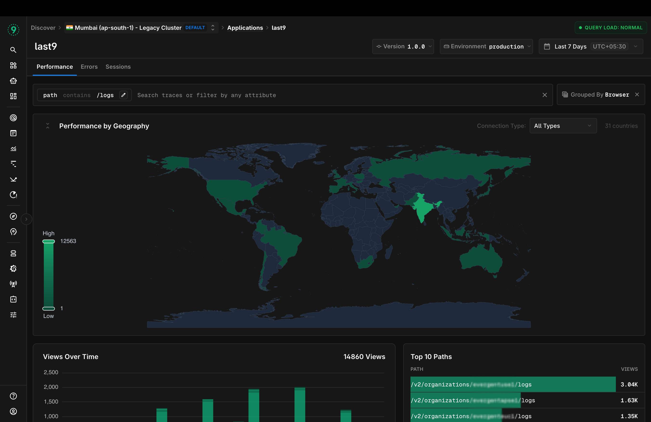 Later on we added filters so I can zoom in and out to my liking say I just want to look at all logs page performance. Add a filter for contains /logs and then I want to group it by let's say Browser to see if we are not performaning well on certain browser i.e. Firefox. Followed up that with a geo map giving up regional insights on whether your performance is not good in particular regions. We did something similar for errors as well