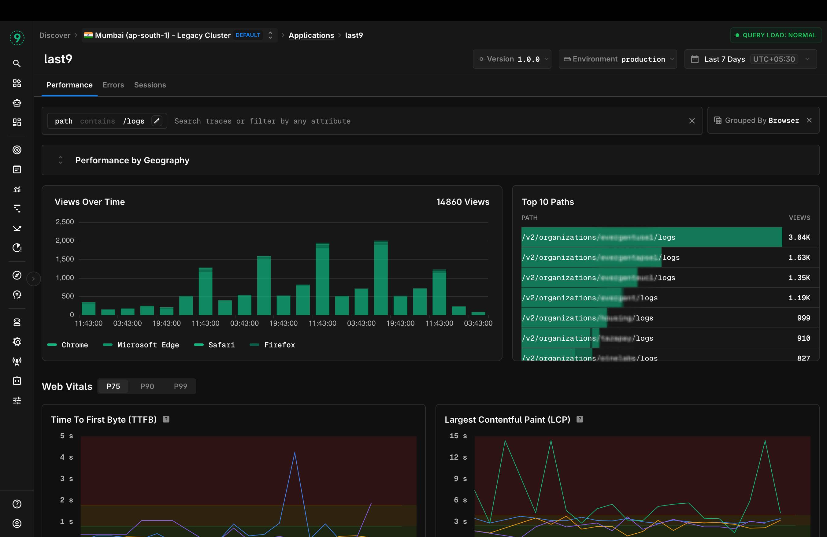 So we started with Performance, with a number of performance audits I have done for various orgs I had a rough idea of how I approach performance issues. First we need to understand what pages in your app might even have issues, we started at this. We built an SDK that collects web vitals on each page and we gave a summary of all Views with top 10 paths. As you can see in the above image this is the zoomed out view not for debugging but telling you what needs debugging. Your top 10 paths, traffic patterns and rough overall performance of what real users are experiencing.