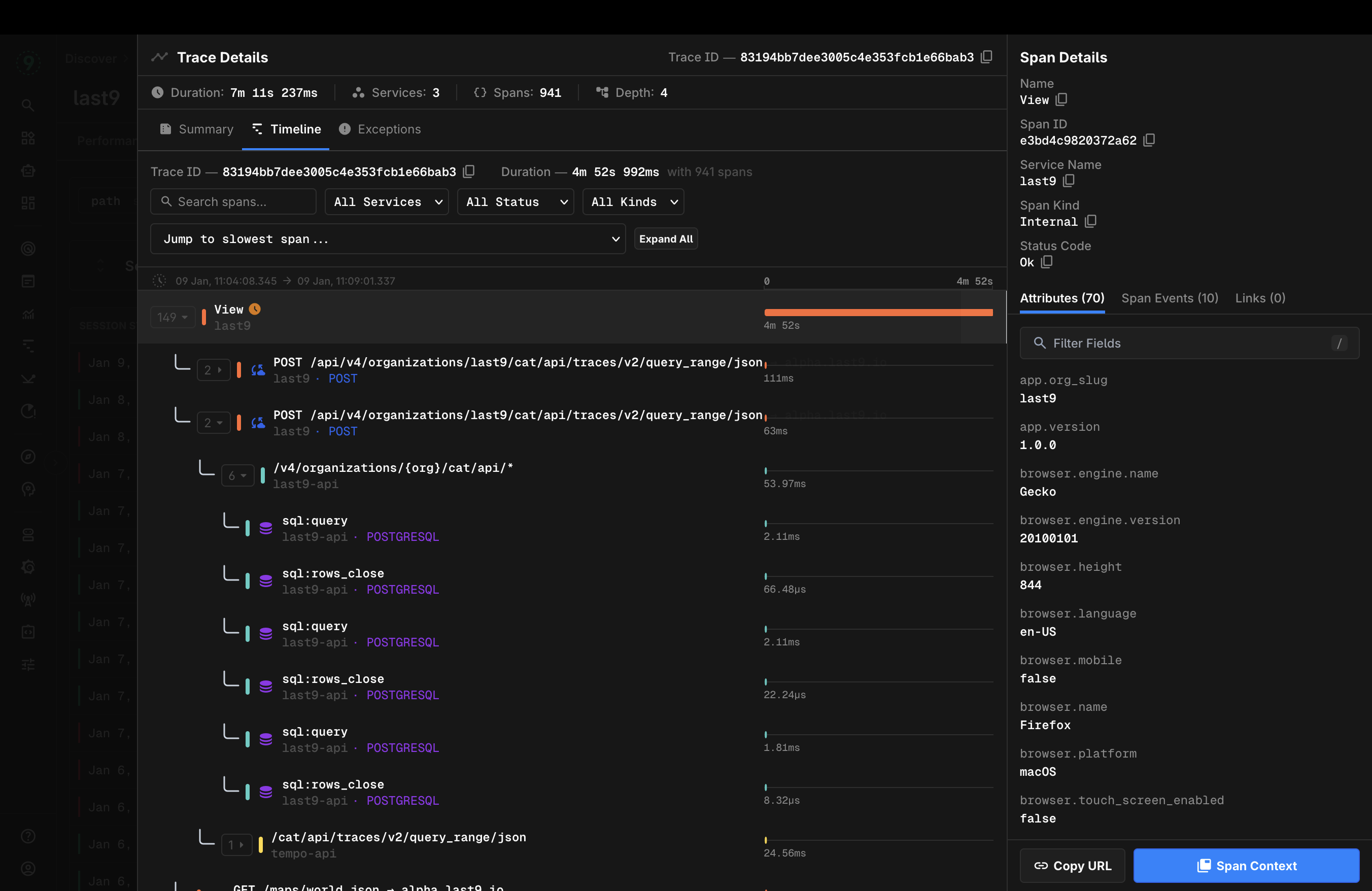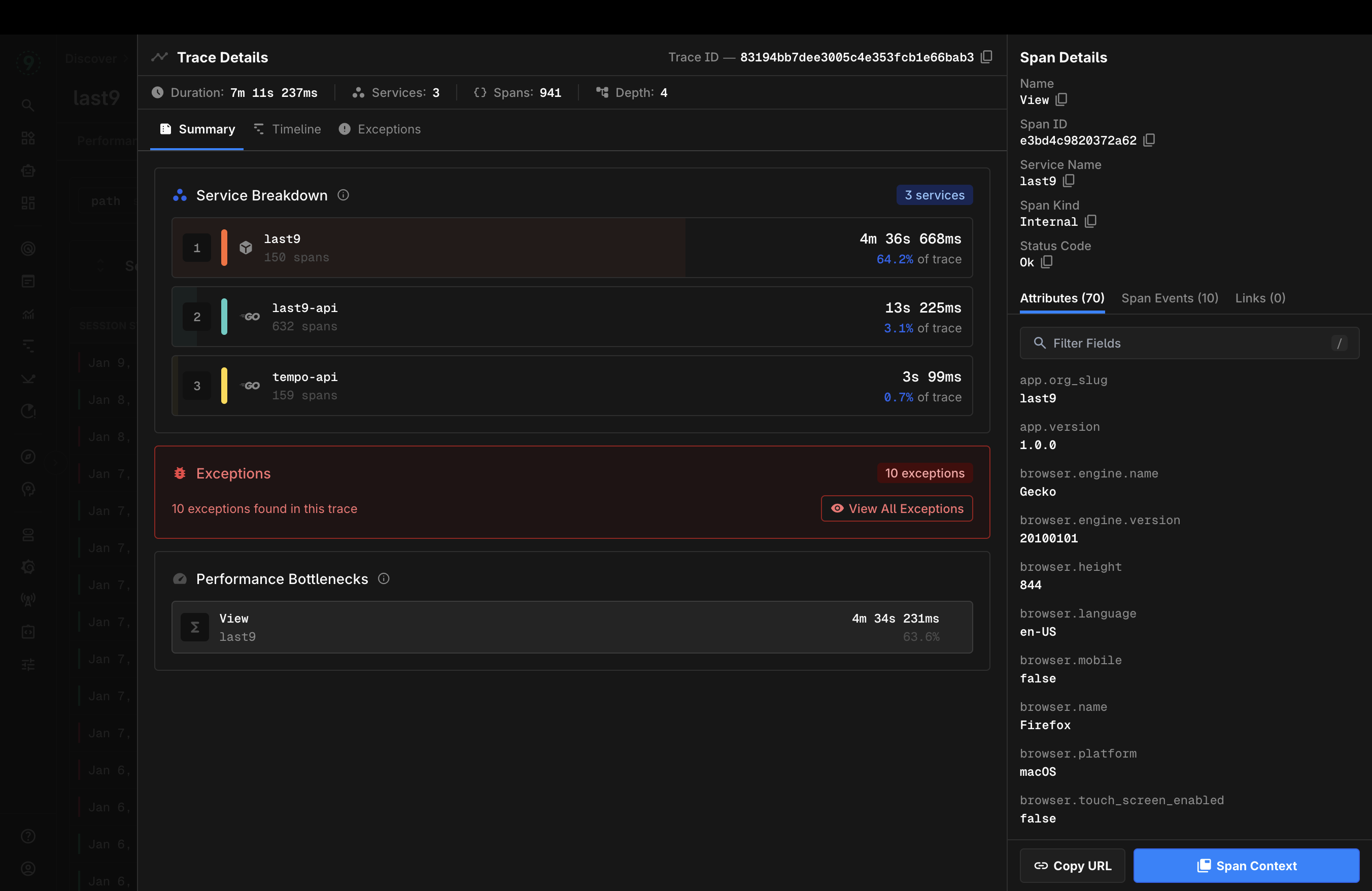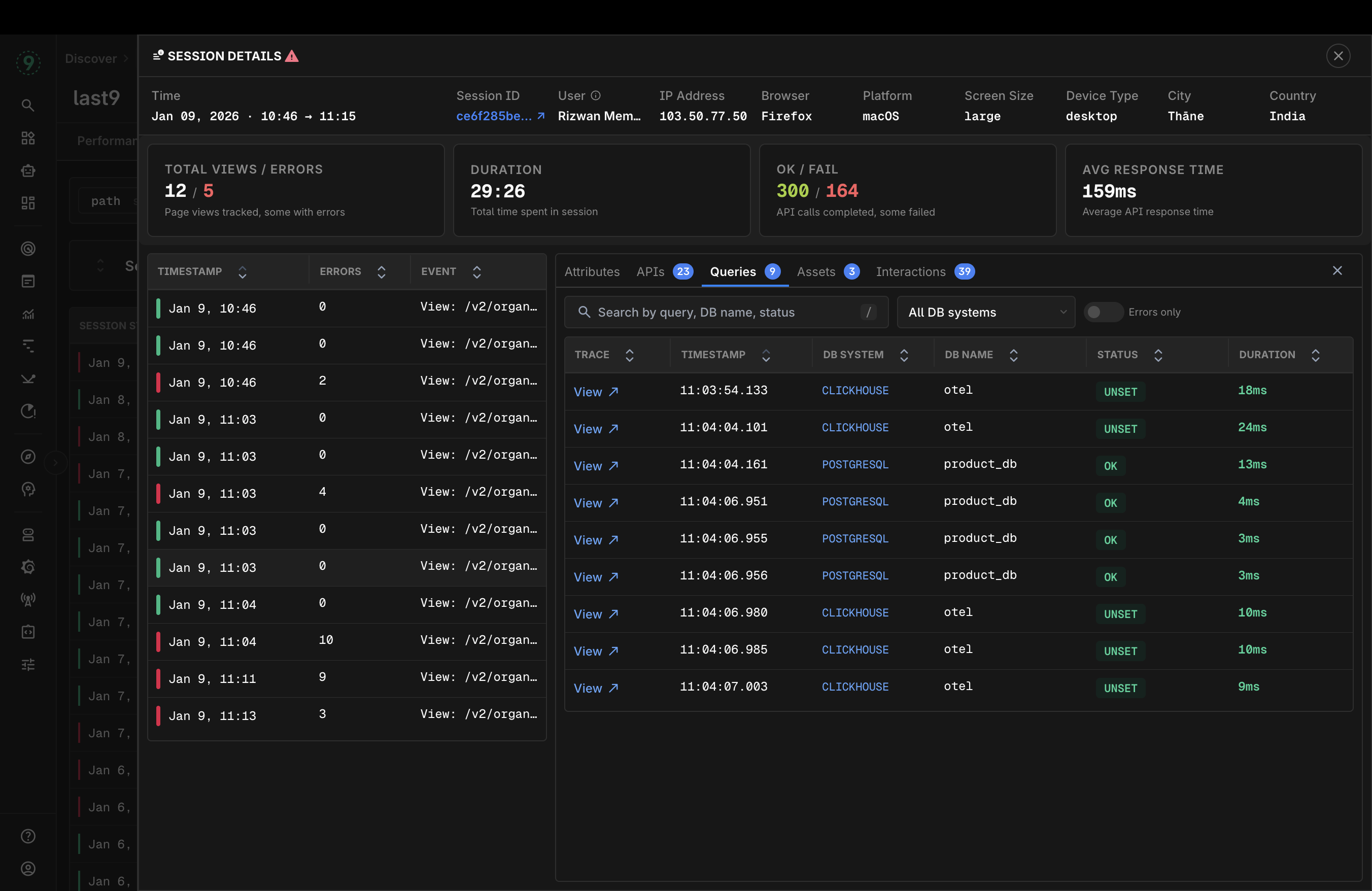 Let's talk about a View inside a session this is where things get real interesting. If you are also intrumenting backend, db and all services. You can co-relate them here check out trace details below there you can see the whole picture. Frontend -> Proxy API -> Backend -> DB you get the point. All errors/exceptions from all services this has been a game changer but this is still a v0 for us. We need to tie up all ends here with the AI era no one is opening documentations / dashboards etc (sorry tailwind we love you it will all work out) so I have moved on to AI applications and handing this to the lovely Frontend team I helped put together here I know it is in good hands :handshake
